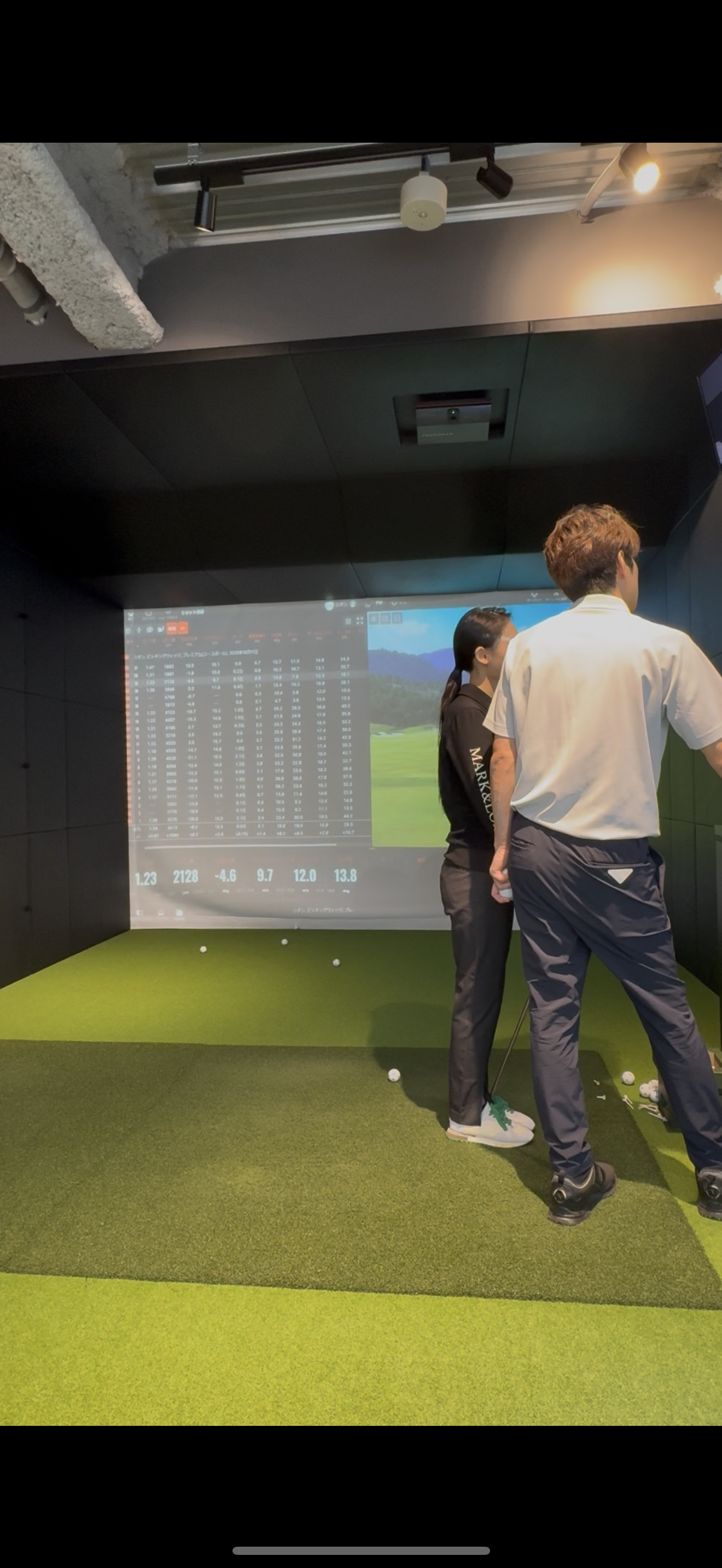 そしてTRACKMANで弾き出された数値や実際の動きを大型3台のモニターで確認することが可能に。そうすることで実際の感覚とデータを擦り合わせ、さらにレッスン内容の確かな証左へと繋がります。