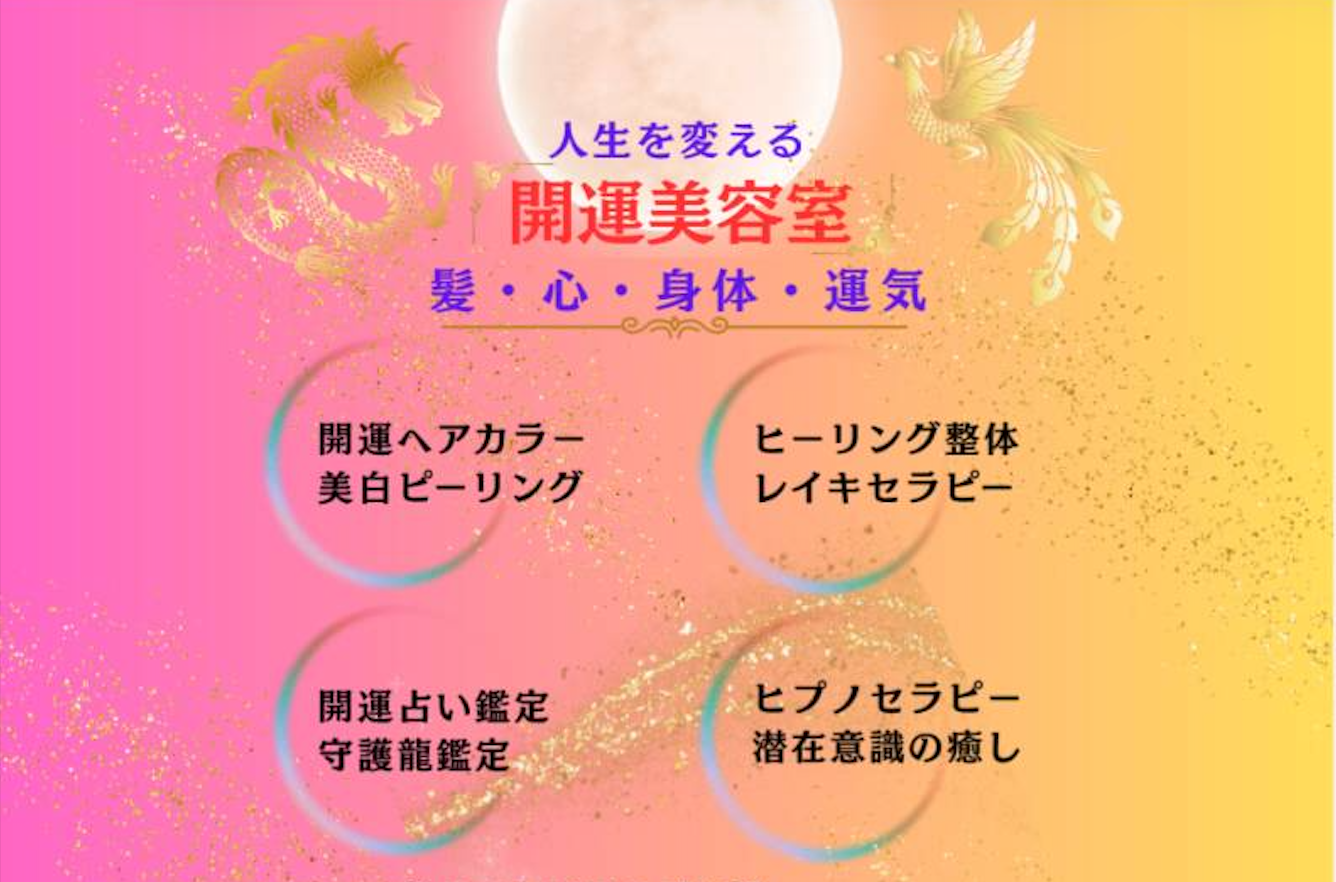 プライベートな時間を過ごして頂けます。ヘアカラーではヘアコーティングがセットでつき、ツヤサラ髪の仕上がり。夜エステのスーパー美白ピーリングは古くなった角質を除去することで、シミ、しわ、くすみをなくしてうるおいのある肌が再生されます。占い鑑定で不安や悩みの解消、算命学で運氣を鑑定します。さらにレイキヒーリングて心と身体の滞りを解消。守護龍鑑定もいたします