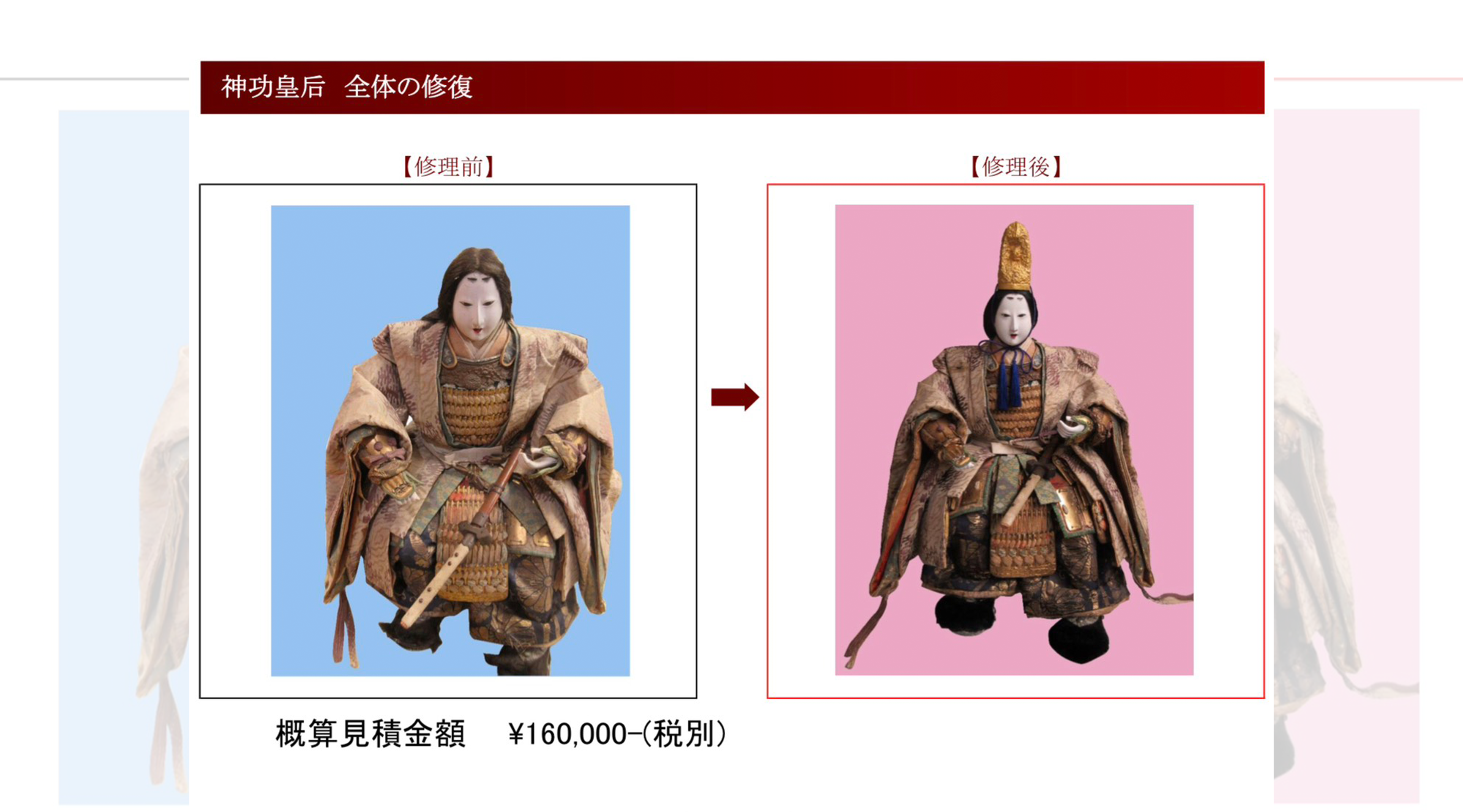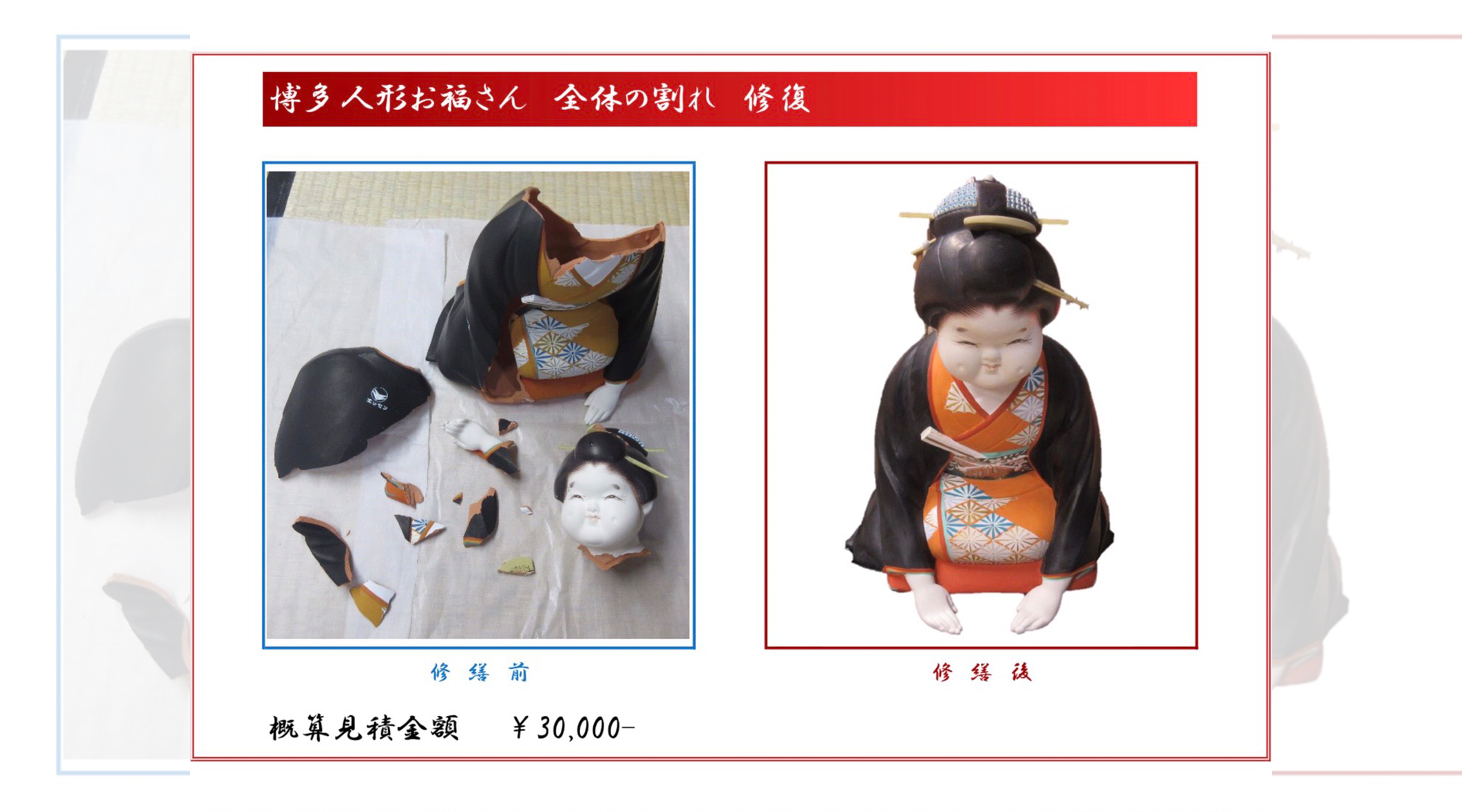 人形修理には「取り替える」ではなく「生かす」事が大事です。代々引き継いだ人形を大切されている方の思いをかなえるために人形修理職人「福田匠庵」を立ち上げました。室町時代から令和までの新旧のお人形類を高度な技術で完成度の高い修理、修復、復元を致します。思い出がそれぞれの形をしているように、人形の修理も一つの技術では解決できないものもあります。唯一の人形修理に取り組むには、唯一の技を持つ職人がそれぞれのケ-スに、それぞれの最善のやり方で、高度に専門化された修理工程を、当職人がお応え致します。