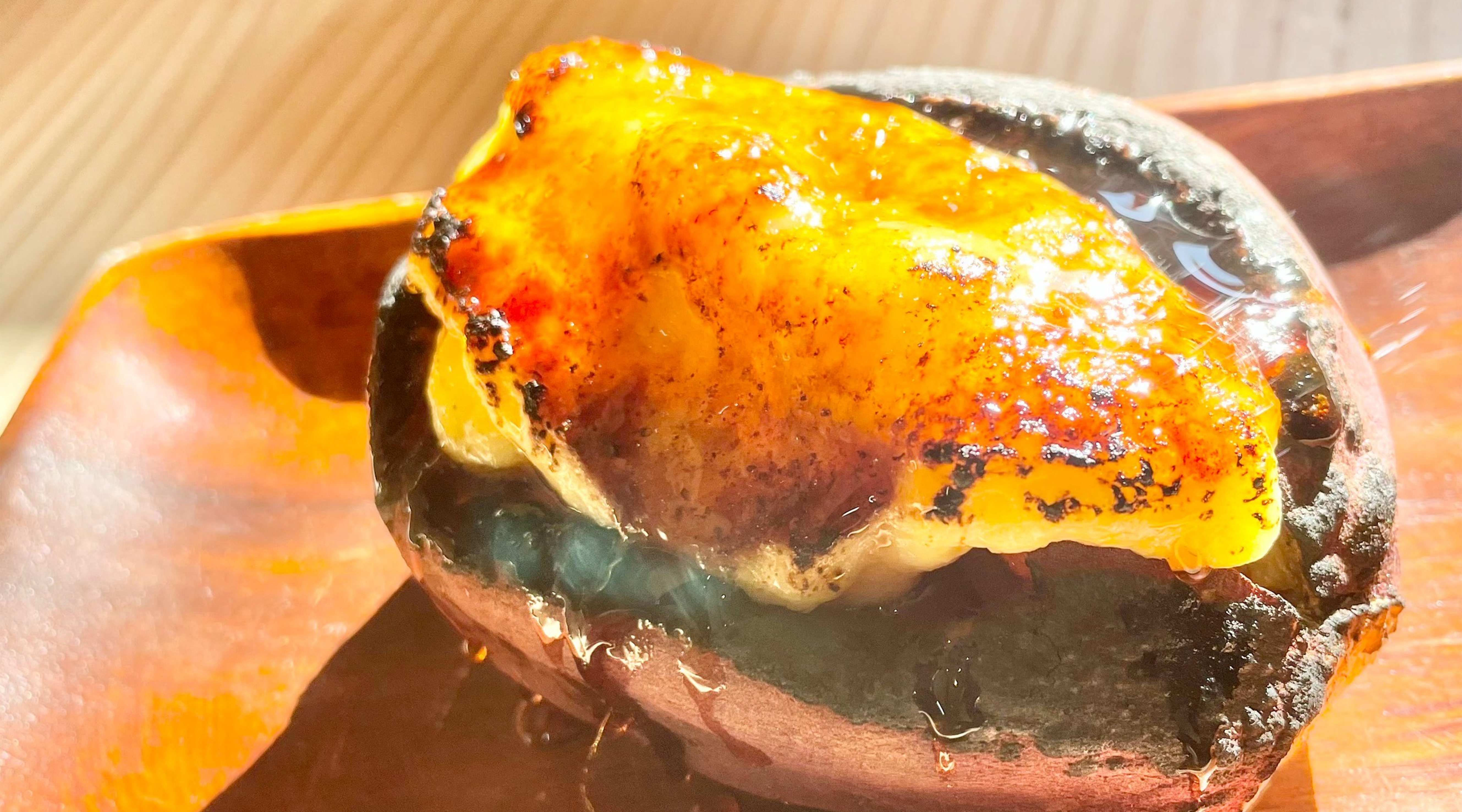 焼き芋をバカっと2つに割り、表面をバーナーでブリュレに、その上に大きいアイスクリームをのせたボリューム満点の蜜芋ブリュレです。