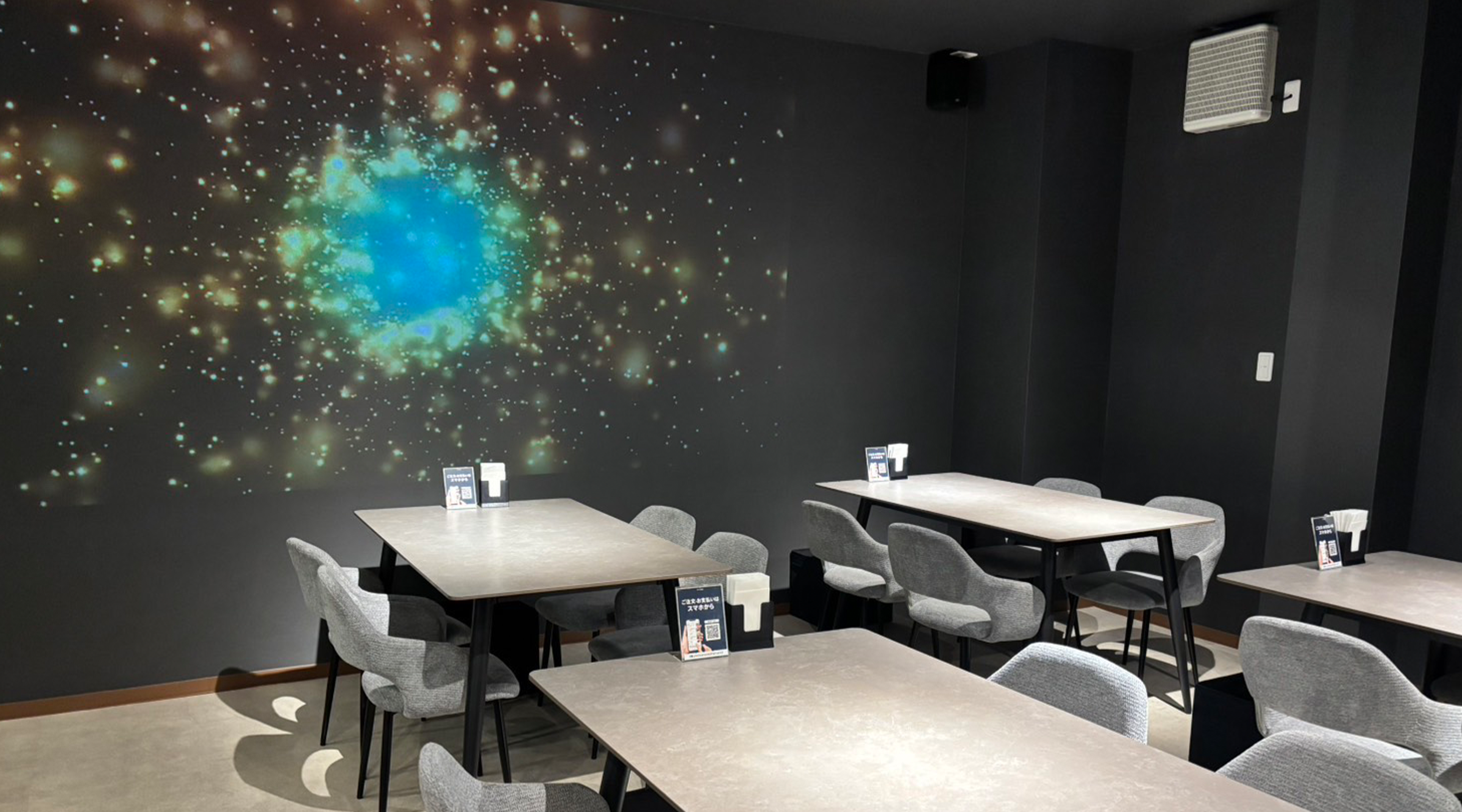 落ち着いた照明の店内では、壁面にプロジェクターで歌が流れ、音と映像が夜の時間を心地よく演出します。DVD・Blu-ray再生やスマートフォンのミラーリングにも対応しているため、宴会の二次会はもちろん、簡単な打ち合わせや会議利用も可能。料理とお酒を楽しみながら、会話や映像をゆったりと共有できる、使い勝手の良い大人のダイニングバーです。